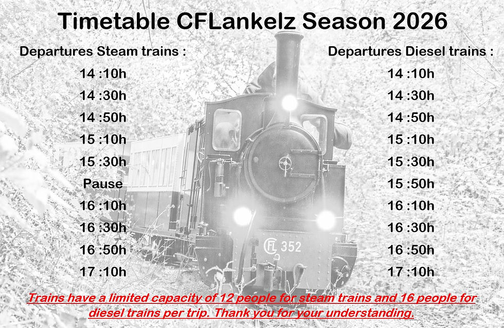 Another year has passed! Our operating season starts again on May 1st, 2026. Our entire layout is operational, and our whole fleet, including the steam locomotive, is ready. A lot of work has been done over the winter. There's also a change this year. Due to the high number of visitors, we've introduced a timetable. Train tickets will now be issued. For safety reasons, the number of seats per carriage will be reduced to 2 adults and 2 children.